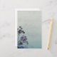 Artigos de papelaria bonito com as flores roxas no fundo azul do inclinação