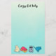Papel de carta com as palavras: "Senhora Louca de Gato" escrito em letra de moda. 4 gatos bonitos abaixo do texto. Cada gato tem uma personalidade única. Um é um gato legal com óculos de sol e uma gravata, outro é um gato sonolento, um é um gato olhando, e um é um gato brincalhão arranhado numa caixa que parece pronto para pular. Coloque um pano de fundo verde colorido.