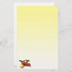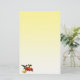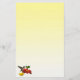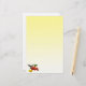 Esta papelaria apresenta uma fêmea de beija-flor-garganta-rubi. Ela paira no ar enquanto o néctar do bebendo do centro ouro de uma flor vermelha brilhante da zínnia. Uma flor amarela da zínnia está por perto e algumas folhas verdes completam a composição. As cores parecem brilhar contra o fundo de gradiente amarelo.