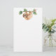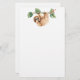 Papel de papelaria com uma preguiça adorável pendurada de cabeça para baixo de um galho de árvore. Ramo de árvore é decorado com folhas e bagas tropicais.