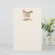 Papel de papelaria com uma ilustração de uma preguiça marrom e giro de cabeça para baixo. Esta pequena cara engraçada está segurando um galho que tem um pássaro rosa em um lado do galho e um buquê de rosa ao estilo rabisco do outro lado. Abaixo deles está um arranjo de flores coloridas desenhadas à mão. Esta preguiça adorável também tem bochechas rosadas rosa e 3 corações bonitinhos no seu bumbum.