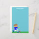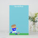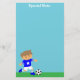 Estes artigos de papelaria bonitos são grandes para os meninos que são fanáticos do futebol ou uma estrela mundial do futebol! Vêm com um menino bonito em um jérsei de futebol azul na moda com estrela, as listras brancas nas capas, shorts brancos e as botas azuis de harmonização do futebol completos com os parafusos prisioneiros que obtêm prontos para retroceder uma bola de futebol para o objetivo! O texto lê "a nota especial: " que você pode personalizar com o nome ou mensagem da criança.