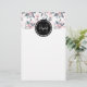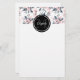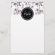 Papel de papelaria - borda superior desenhada com um padrão elegante feito com uma ilustração aquosa de flores cor-de-rosa com folhas e caules de cinza azul. Um círculo preto em camadas por cima com seu nome e dentro inicial de monograma.