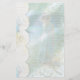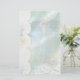 Uma mulher ao lado de um lago e vestindo um vestido azul com um lago azul ao seu lado e aterrisse atrás dela em segundo plano. Colar no lado esquerdo, papel branco revestido e rodeado de borda ornamental ouro com fundo de tartaruga.