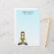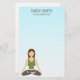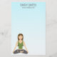 Ilustração vetorial na moda de uma linda garota morena fazendo ioga. A mulher está sentada na posição tradicional de lótus. Ela está vestindo um tanque verde e calças de cinza escuras. O fundo é um adorável gradiente azul. Há também um texto que diz "instrutor de Yoga junto com uma área de texto personalizável para um nome.