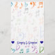 Este design de papel de carta apresenta um padrão que envolve várias notas de música e símbolos de notação de música coloridos de várias cores. Ele também apresenta um nome personalizado próximo à parte inferior, entre duas formas cardíacas. [~Z0000113]
