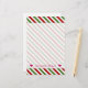 Este design de papelaria apresenta um padrão de listras vermelhas, brancas e verdes. Estas são cores comumente associadas ao Natal. Ele também apresenta um nome personalizado próximo à parte inferior, entre formas cardíacas. [~Z0000011]