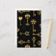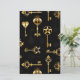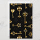 Padrão perfeito de chaves antigas, douradas e silhuetas em fundo preto.
