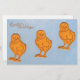 Um cartão postal vintage / antigo Felz pascoa com três pintinhos de feltro amarelo felpudo, todos seguidos. Fundo em azul. Felz pascoa!