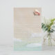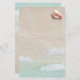 Papel de carta alinhado com areia de praia e concha rosa. Bonito papelaria de praia para notas pessoais escrevendo de mão para qualquer um. Ambas as faces são decoradas com areia e imagem de surf contendo água azul turquesa tropical. As ondas estão vindo de baixo na frente e para baixo do topo na parte de trás. Uma imagem da casca do concha rainha fica no topo e as linhas são cinzas de luz.