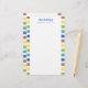 Da mesa de papelaria com bordas listradas coloridas em cores mudas de castanho, amarelo, verde e azul personalizadas com seu nome em azul. Papel de carta personalizado, azul e verde, impresso com o seu nome abaixo da mesa do.