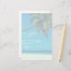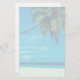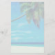 Papel de carta com fotografia tropical apresentando uma palma de coco que se estende através de uma praia de areia branca isolada. Águas turquesas e um céu azul azul de azure no fundo.
