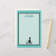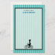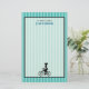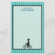 Uma ilustração retrógrada fofa. Uma silhueta de uma mulher num rabo de cavalo, vestindo um vestido e andando de bicicleta. O fundo é um padrão listrado azul-turquesa com tons claros e escuros alternados. Uma camada transparente com uma borda preta fica no centro para fácil escrevendo. O topo diz: uma nota de: (nome). Personalize com seu nome.