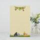 Papel de papelaria com tema legal safari. Projetado com uma faixa de folhas da selva no topo e macacos maliciosos pendurados de cabeça para baixo. Um hipopótamo, gorila, leão e girafa pendurados no fundo em algumas gramíneas de savana. Colocado sobre um fundo bronzeado.