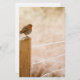 Design apresenta uma fotografia de um belo pássaro vermelho-assado-assado num poste de feno.