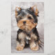 Filhote de cachorro maravilhoso do yorkshire terrier no fundo de matéria têxtil