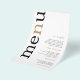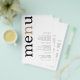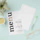 PAPER Cardápio de Casamento Simples Branco Tipografia Preto e Dourado. Uma ótima opção de PAPER (não cartão) no tamanho 5,5” x 8,5”. Um design tipográfico moderno com Cardápio em tipografia grande em preto com o ”n” em dourado rotacionado e à esquerda em um fundo branco.