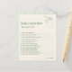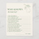Comemore a noiva a ser com este chá de panela Perfeito de Pear que Conhece a melhor placa de jogo da Noiva, com peras desenhadas à mão, verde macio e tipografia elegante de scripts. Uma maneira divertida de fazer os convidados rindo e compartilhando memórias, este jogo de chá de panela do tema pera desafia os amigos e a família a ver quem conhece melhor a noiva. Perfeito para eventos rústicos, de fazenda ou inspirados em jardim, este cartão de atividade de chá de panela combina lindamente com convites, placas e decorações de pera correspondentes.