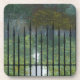 Uma paisagem tridimensional no início do outono, mostrando um caminho que caminhava pela grama em uma floresta névoa de árvores velhas e encharcadas. Mas o caminho supercrescido é barrado por um portão de picos negros de ferro entre paredes escuras de tijolos. Criado em Vue.