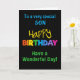 Um Cartão de Aniversário colorido para um Filho, com letras brilhantemente coloridas num fundo preto, a palavra "feliz" em amarelo e a palavra "aniversário" em cores arco-íris.