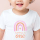 Nossa Camiseta de Bebê de Um Primeiro Aniversário de Menina Fofa apresenta um arco-íris em aquarela rosa e pêssego fofo, com um arco-íris nas costas. Adicione o nome à camiseta de 1º aniversário do seu filho. Perfeito para a festa de primeiro aniversário de uma menina!
