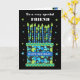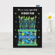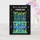 Um cartão de aniversário brilhante para seu amigo, com muitas velas padronizadas em um bolo de aniversário. No topo do cobrir da frente, as palavras "Para um AMIGO muito especial" estão em letras brancas sobre o fundo preto. Há uma banda azul ao redor do bolo com "FELIZ ANIVERSÁRIO!" também em branco. Minúsculas estrelas azuis, verdes e brancas estão espalhadas em volta do fundo preto e o dentro é apenas uma sugestão, que você pode facilmente mudar ou apagar se quiser.