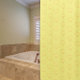 Coração vermelho em fundo amarelo. Cortina chá com padrão minimalista.