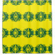Uma cortina de chá amarelo brilhante com um padrão geométrico verde-arrojado.