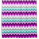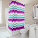 Uma cortina de chá com um lindo e colorido padrão design de chevrons em ameixa roxa, lilac, branco, minúsculo, turquesa e cinza.