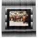 Esta cortina de chá bonito mostra um design de gradiente preto e cinza ao redor de uma fotografia de uma linha de cavalos de trilha todos selados e prontos para andar. Uma cortina de chá perfeita para amantes de cavalos.
