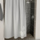 Uma cortina de chá moderna que pareceria excelente no seu banheiro. Com uma trio de margaridas brancas no canto.