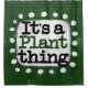 "É Uma Coisa de Plantas" é um design de texto bonito em verde com texto preto e vermelho, junto com uma forma de sotaque branco e pontos brancos texturizados ao seu redor.