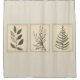 O centro desta cortina de chá bonito tem um design central de três quadros contendo cada um um um tipo diferente de verde, folhagem num fundo de estilo pergaminho. A cor principal é uma cor bege ou verde neutra que funcionará em quase qualquer banheiro. Esteiras de banho também disponíveis