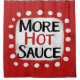 "Mais Molho Quente" é um design de texto fofo em vermelho com texto preto e vermelho, juntamente com uma forma de sotaque branca e pontos brancos texturizados ao seu redor.