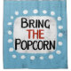 "Traga a pipoca" é um design de texto fofo em azul claro com texto preto e vermelho, junto com uma forma de sotaque branca e pontos brancos texturizados ao seu redor.