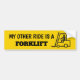 Minha outra carona é uma empilhadeira em letras maiúsculas pretas misturada com uma imagem ícone de uma pessoa no empilhadeira. Montado em amarelo de construção vívido sólido.