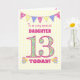 Um cartão de aniversário de 13 bonito para sua filha, com bunting de bolinhas, flores de primata e números preenchidos com um padrão de purrose, todos em um fundo de gingham amarelo pálido. A mensagem do cobrir é: "Para uma FILHA muito especial 13 HOJE!" A mensagem dentro é apenas uma sugestão e você pode personalizá-la facilmente ou excluí-la se preferir.