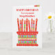 Você pode adicionar a idade a este cartão de aniversário brilhante para seu meio-irmão, com um bolo de aniversário de morango. O bolo tem muitas velas com diferentes padrões e há uma banda com padrões em volta do bolo com frutas coloridas de verão - morangos, framboesas, limões e fatias de laranja. Acima do bolo, a saudação, em letras vermelhas, é "FELIZ BIRTHDAY a um Passo Irmão muito especial" e no bolo há espaço para você acrescentar a idade, seguida de "anos de idade hoje!" em letras brancas. Sinta-se à vontade para personalizar a mensagem dentro, se desejar; você pode alterar a fonte e a cor, assim como a mensagem.