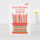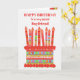 Você pode adicionar a idade a este cartão de aniversário brilhante para seu namorado, com um bolo de aniversário de morango. O bolo tem muitas velas com diferentes padrões e há uma banda com padrões em volta do bolo com frutas coloridas de verão - morangos, framboesas, limões e fatias de laranja. Acima do bolo, a saudação, em letras vermelhas, é "FELIZ BIRTHDAY a um Namorado muito especial" e no bolo há espaço para você acrescentar a idade, seguida de "anos de idade hoje!" em letras brancas. Sinta-se à vontade para personalizar a mensagem dentro, se desejar; você pode alterar a fonte e a cor, assim como a mensagem.