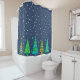 Um moderno design geométrico de cinco árvores de abeto em lacaio, turquesa e ouro amarelo. O céu está marinho com neve branca caindo.