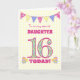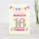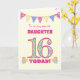 Uma carta de 16 de aniversário bonito para sua filha, com bunting de bolinhas, flores de primata e números cheios de padrão primata, tudo em um fundo amarelo pálido de gingham. A mensagem do cobrir é: "Para uma FILHA muito especial 16 HOJE!" A mensagem dentro é apenas uma sugestão e você pode personalizá-la facilmente ou excluí-la se preferir.