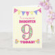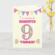 Um cartão bonito de 9 de aniversário para sua filha, com bunting de bolinhas, flores de primata e números cheios de padrão primata, todos em um fundo amarelo pálido de gingham. A mensagem do cobrir é: "Para uma FILHA muito especial 9 HOJE!" A mensagem dentro é apenas uma sugestão e você pode personalizá-la facilmente ou excluí-la se preferir.