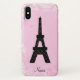 Esta Paris elegante inspirou características do caso 4/4s do iPhone uma torre Eiffel cor-de-rosa e preta em um fundo swirly cor-de-rosa e o nome ou texto de sua escolha.