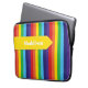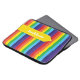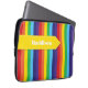 Esta brilhante bolsa de laptop de padrão listrado do arco-íris tem uma faixa amarela com detalhes de costura brancos no topo. Ele é personalizado com um nome ou qualquer texto que você queira adicionar.