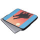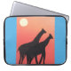 Esta manga de computador foi projetada com a minha representação de duas girafas silenciadas por um pôr do sol laranja.