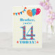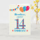 Um cartão de aniversário colorido para um irmão de 14 anos, O grande número 14 está cheio de um padrão laranja, vermelho e azul, esboçado em azul brilhante. Há balões e bunting no topo, em cores coincidentes e a saudação do cobrir é, 'Irmão, você tem 14 anos hoje!' em letras brilhantes vermelhas e azuis, em um fundo bolinhas amarelo e branco muito pálido, com estrelas vermelhas e laranja em cada lado da palavra 'HOJE!'. A mensagem dentro pode ser facilmente personalizada ou excluída se você desejar.