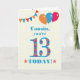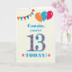 Um cartão de aniversário colorido para um primo de 13 anos, O grande número 13 está cheio de um padrão laranja, vermelho e azul, esboçado em azul brilhante. Há balões e bunting no topo, em cores coincidentes e a saudação do cobrir dianteiro é, 'Primo, você tem 13 anos hoje!' em letras brilhantes vermelhas e azuis, sobre um fundo bolinhas amarelo e branco muito pálido, com estrelas vermelhas e laranja em cada lado da palavra 'HOJE!'. A mensagem dentro pode ser facilmente personalizada ou excluída se você desejar.