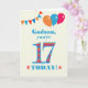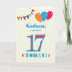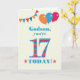 Um cartão de aniversário colorido para um madrinho de 17 anos, O grande número 17 está cheio de um padrão laranja, vermelho e azul, esboçado em azul brilhante. Há balões e bunting no topo, em cores coincidentes e a saudação do cobrir é, 'Godson, você tem 17 anos hoje!' em letras brilhantes vermelhas e azuis, em um fundo bolinhas amarelo e branco muito pálido, com estrelas vermelhas e laranja em cada lado da palavra 'HOJE!'. A mensagem dentro pode ser facilmente personalizada ou excluída se você desejar.