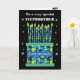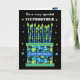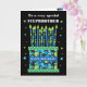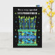 Um cartão de aniversário brilhante para o teu enteado, com muitas velas apadrinhadas num bolo de aniversário. No topo do cobrir da frente, as palavras "Para um IRMÃO MUITO ESPECÍFICO" encontram-se em letras brancas sobre o fundo preto. Há uma banda azul ao redor do bolo com "FELIZ ANIVERSÁRIO!" também em branco. Minúsculas estrelas azuis, verdes e brancas estão espalhadas em volta do fundo preto e o dentro é apenas uma sugestão, que você pode facilmente mudar ou apagar se quiser.