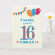 Um cartão de aniversário colorido para um primo de 16 anos, O grande número 16 está cheio de um padrão laranja, vermelho e azul, esboçado em azul brilhante. Há balões e bunting no topo, em cores coincidentes e a saudação do cobrir dianteiro é, 'Primo, você tem 16 anos hoje!' em letras brilhantes vermelhas e azuis, em um fundo bolinhas amarelo e branco muito pálido, com estrelas vermelhas e laranja em cada lado da palavra 'HOJE!'. A mensagem dentro pode ser facilmente personalizada ou excluída se você desejar.